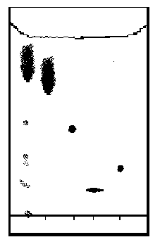 c. Teken het vlekkenpatroon van de opgebrachte oplossingen indien een met octadecylgroepen gemodificeerd silicagel DLC systeem zou zijn toegepast met een aangezuurd methanol/water systeem als loopmiddel.
